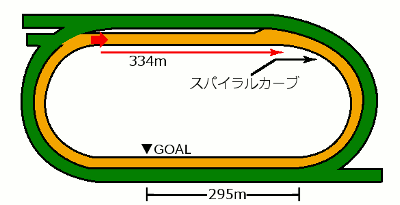 スパイラルカーブとは入り口は緩やかなカーブで、出口はきついカーブのコーナーの事で、スピードを落とさず入り、出口では遠心力で馬群がバラけるような仕組みになっている。