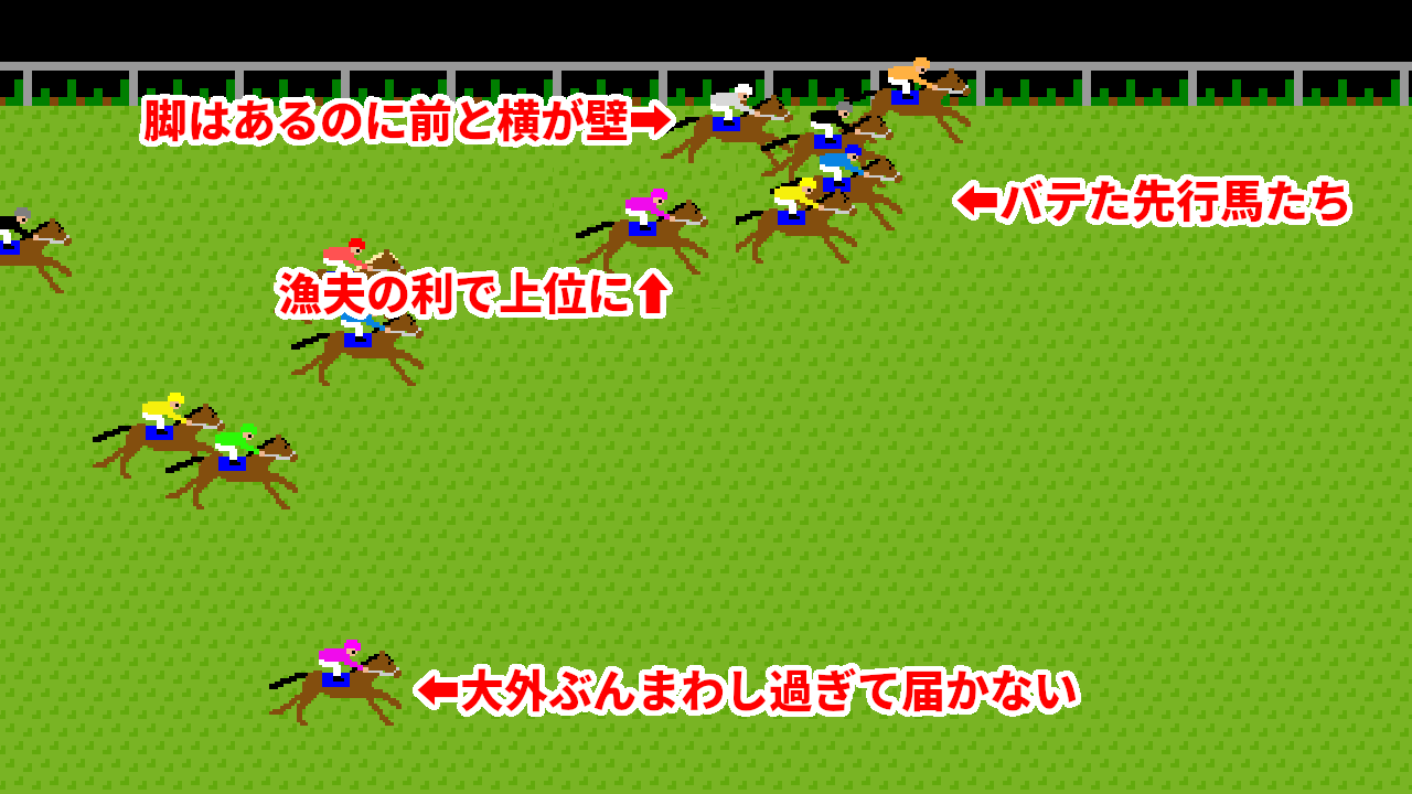 上記の図のように先行馬がバテた場合、その直後にポジションを取ったインコースの差し馬はバテた先行馬が壁になって、すぐには馬群から抜け出せないシーンが良くある。